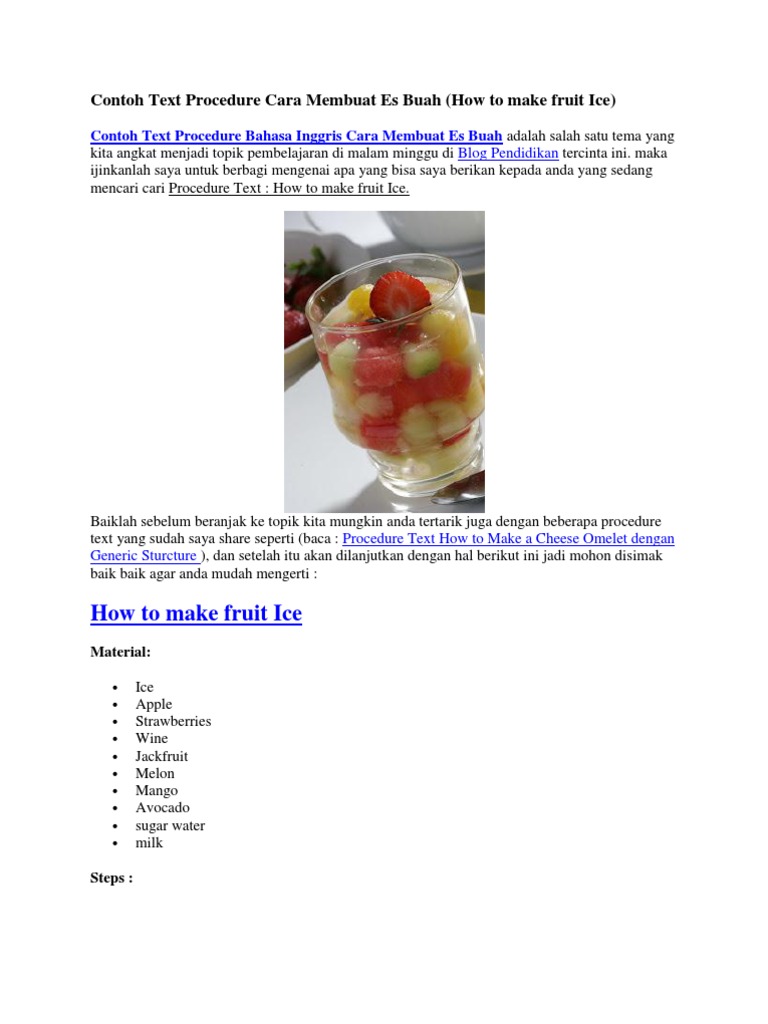 List of steps to be followed. Dan berikut ini saya berikan satu contoh dengan procedure text yang lengkap dan perlu anda coba dan kreasikan sendiri agar menjadi lebih menarik. How to Make a Cheese Omelet - Generic Sturcture terdiri dari 3 bagian yaitu.